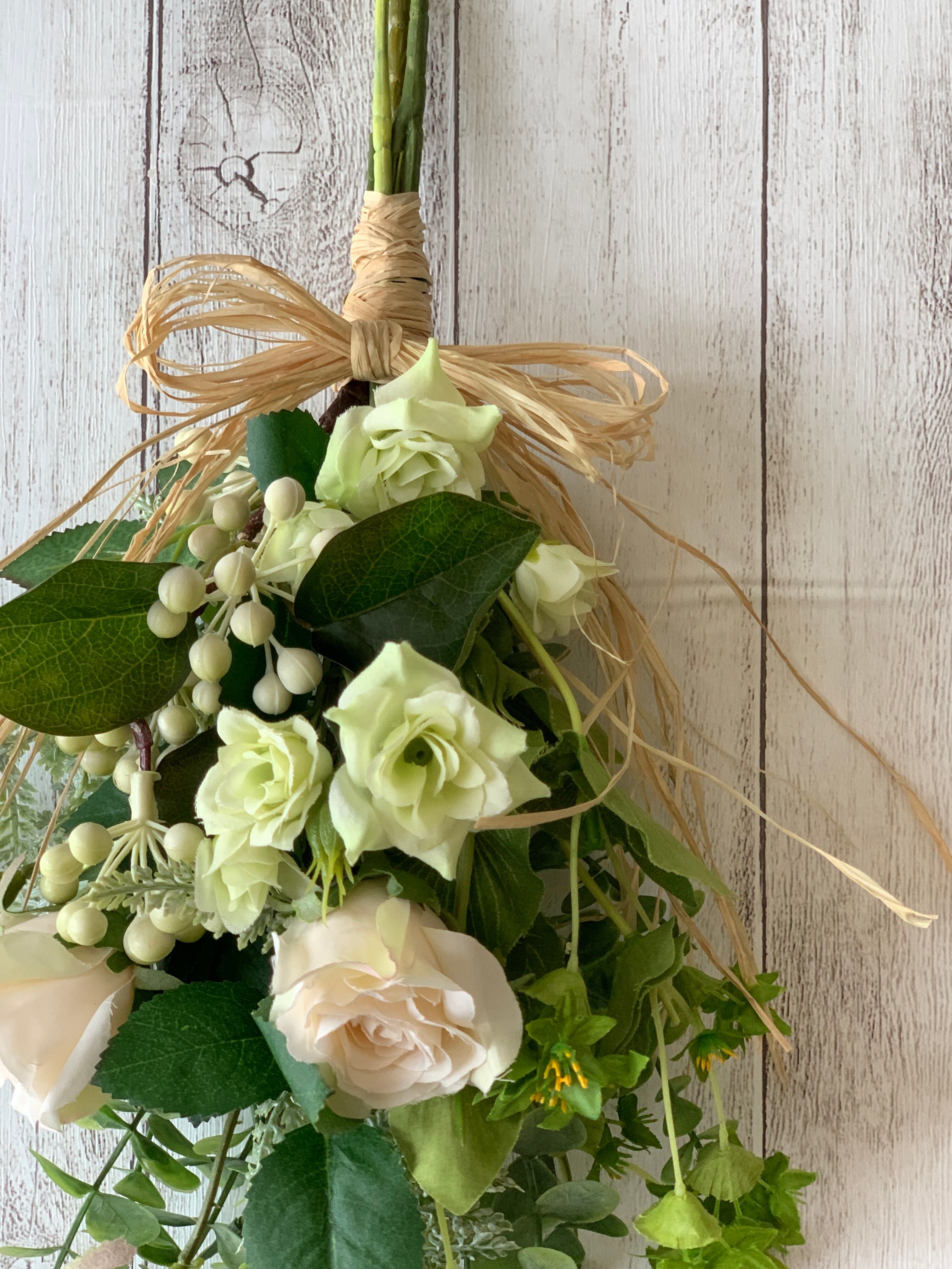 クリーム系とグリーン系の爽やかなスワッグ 玄関 壁飾り プレゼント アーティフッシャルフラワー