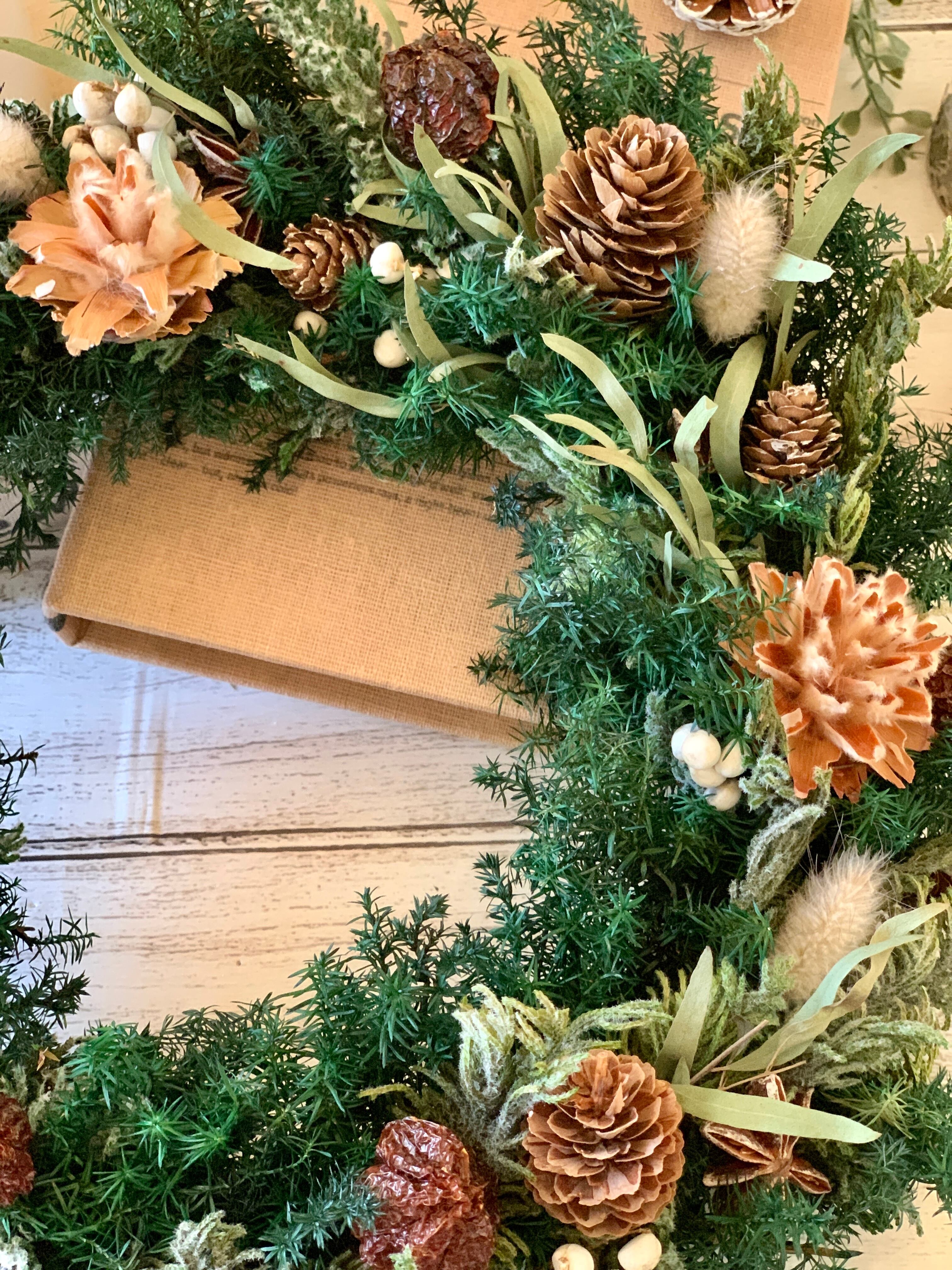 一日の始が気持ちよく過ごして頂きたいと思いから香りが漂うような自然素材を使用したリースを制作しました。