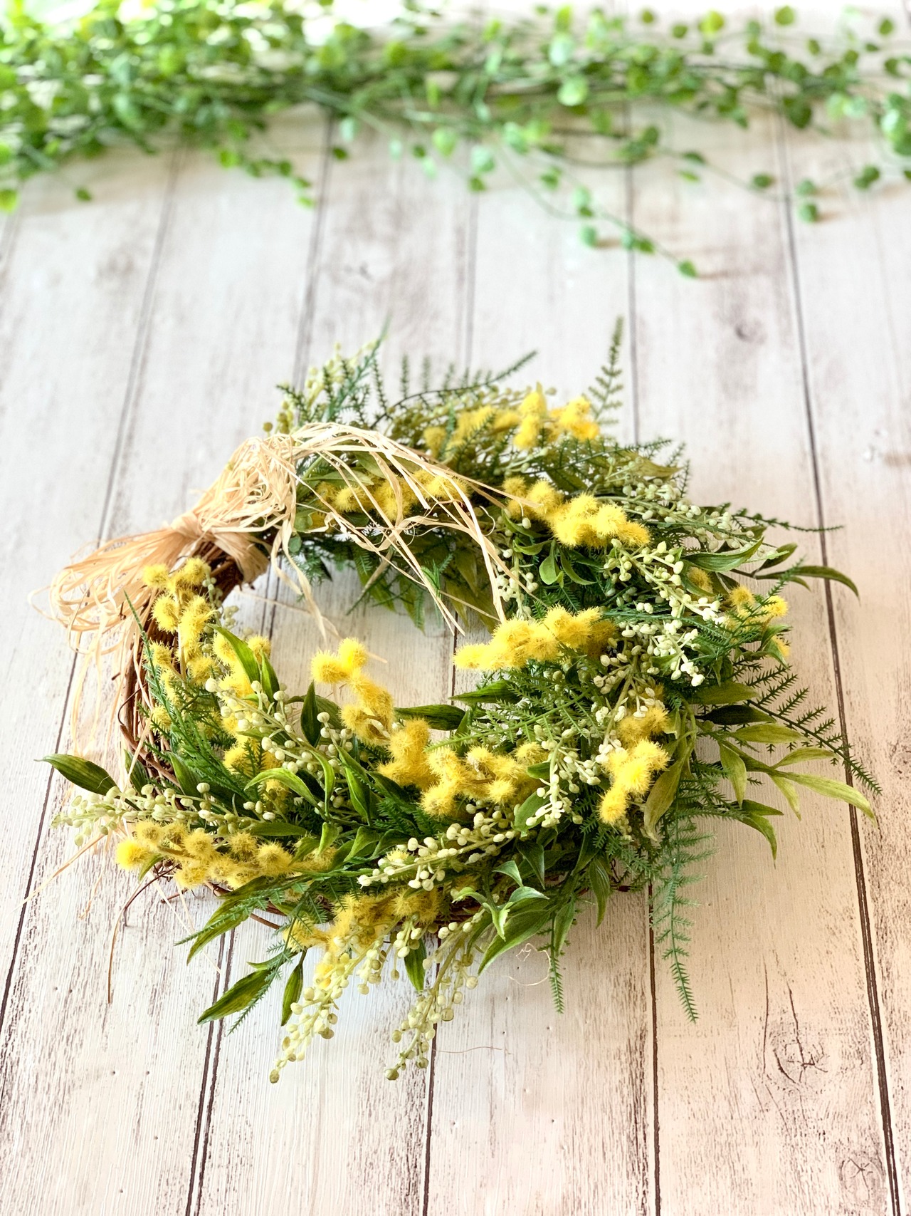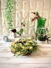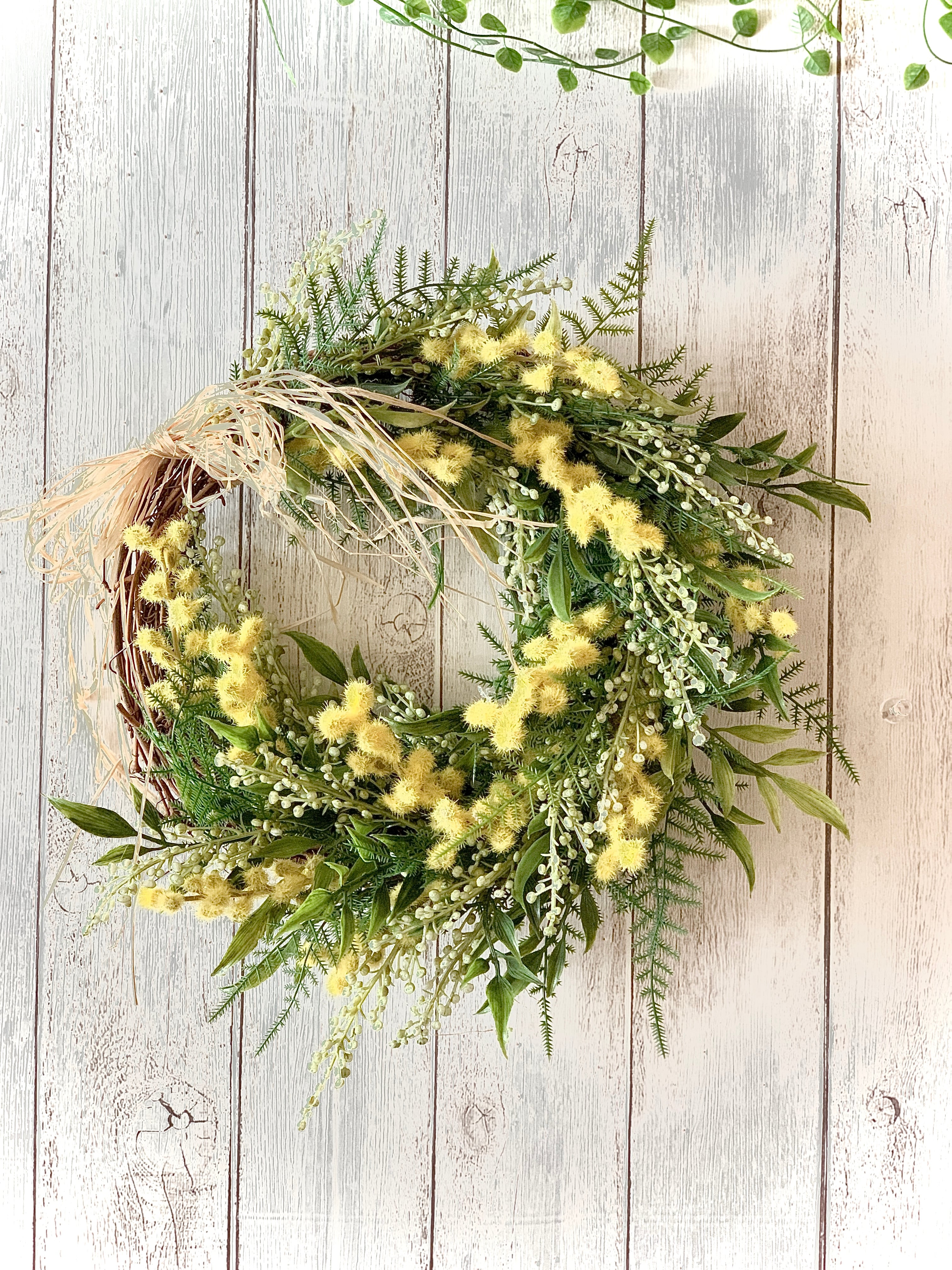 春のウキウキワクワクを感じるように、ミモザやリーフを凸凹と高低差を出して厚みと奥行を作る事で、リース全体をナチュラルに仕上げました。