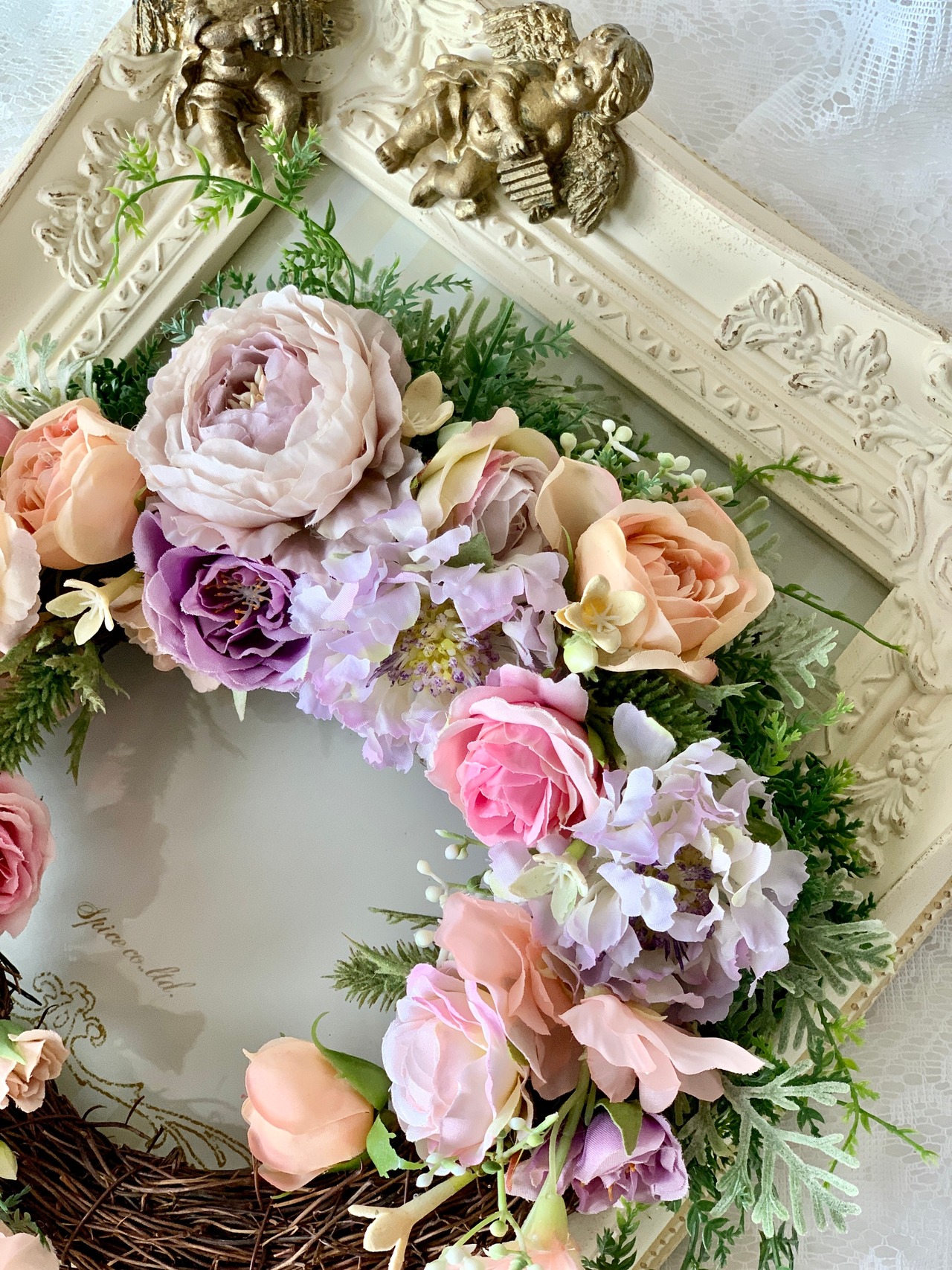 春らしい色合いの優しいリースでお部屋や玄関を明るく華やかにと思いスイトピーとローズのリースを制作しました。